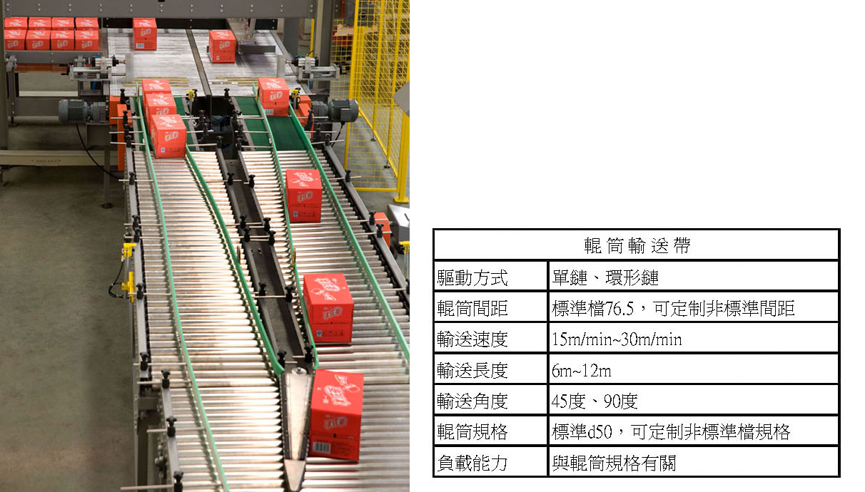 本設備用於紙箱、塑膠箱、桶類物品之輸送。使用本設備可使產品快速輸送到棧板堆疊從而減少人工搬運時間,提高出貨效率。